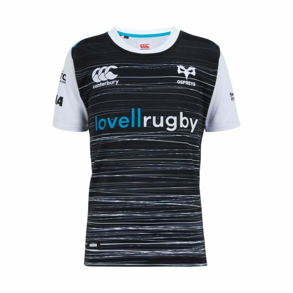 The shirt boasts a sleek grey color, reflecting the Ospreys’ home kit design. It features the official team logo prominently displayed on the chest, showcasing the pride and tradition associated with the Ospreys rugby team. It’s a symbol of support and a must-have for young fans.