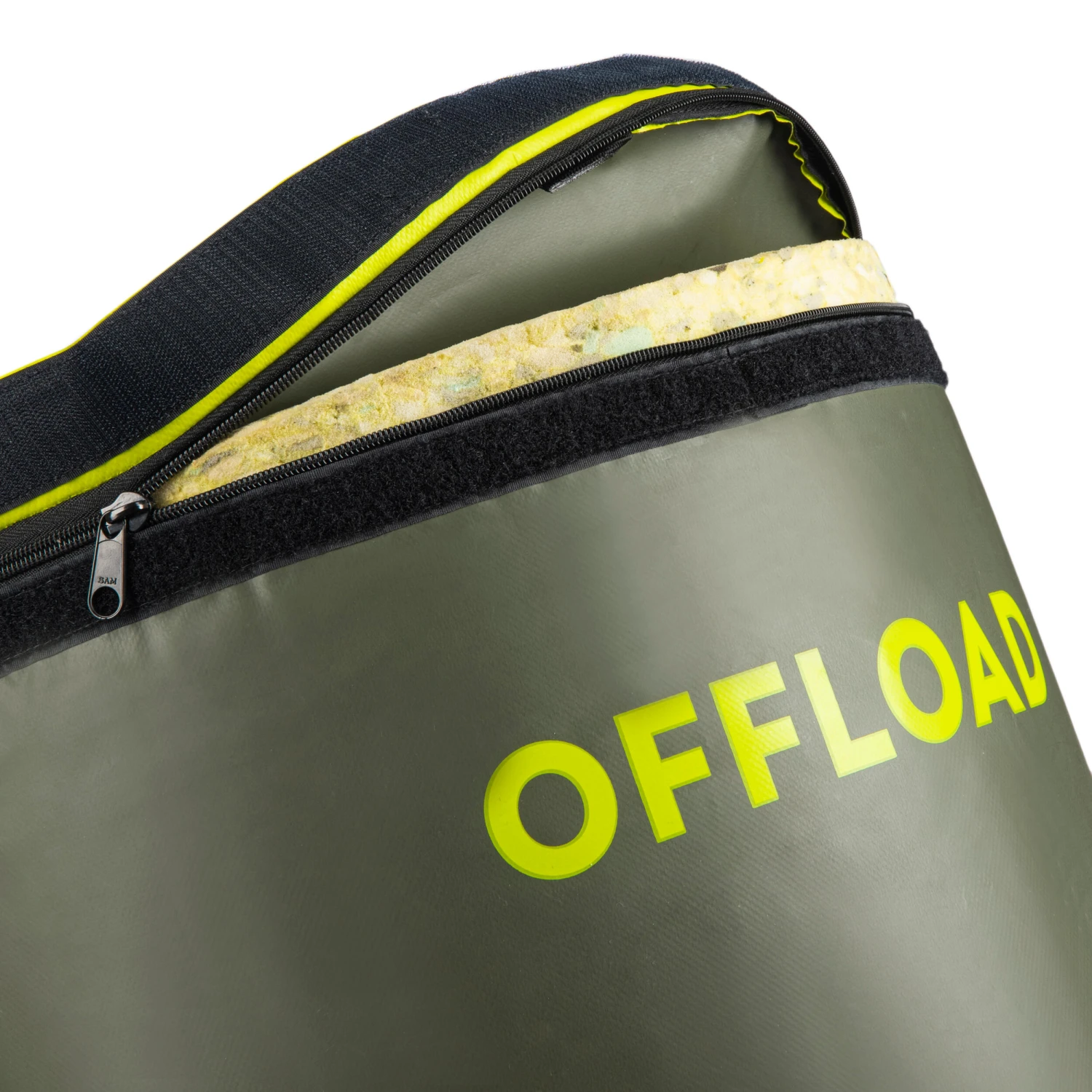 The plastic cover of this tackle bag has a horizontal handle at one end. For your added convenience, we chose a rip-tab fastener instead of a zip.